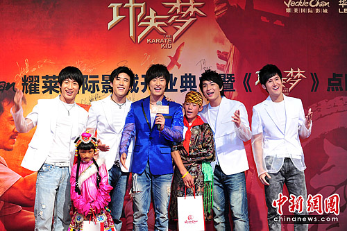 图为新七小福携手玉树小朋友为师父成龙助阵。中新社发 李学仕 摄