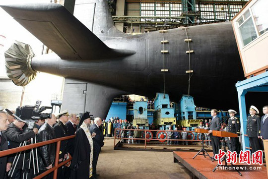 “北德文斯克”号核潜艇属俄罗斯885型“白蜡树”级多用途攻击核潜艇的首艘,可装备携带核弹头的远程巡航导弹,最远射程可达5000公里,可有效攻击水下和水面目标。按计划,“北德文斯克”号将于2011年交付俄罗斯海军。