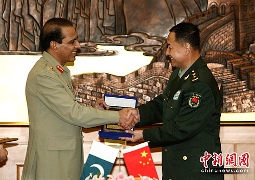 6月17日,副总参谋长侯树森在北京与来访的巴基斯坦陆军参谋长阿什法克·帕尔韦兹·基亚尼举行了会谈。双方就防务安全磋商、部队训练、人员培训等方面进行了交流。中新社发 杜洋 摄