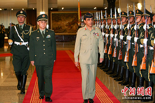 6月17日,副总参谋长侯树森在北京与来访的巴基斯坦陆军参谋长阿什法克·帕尔韦兹·基亚尼举行了会谈。双方就防务安全磋商、部队训练、人员培训等方面进行了交流。中新社发 杜洋 摄