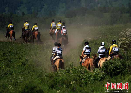 6月17日,新疆喀纳斯景区首届国际马术拉力赛在风光秀美的禾木乡开锣,来自北京、广东及港台地区的31支队伍,近百名骑手将在喀纳斯景区进行为期3天,全程160公里的马术拉力赛。刘新 摄