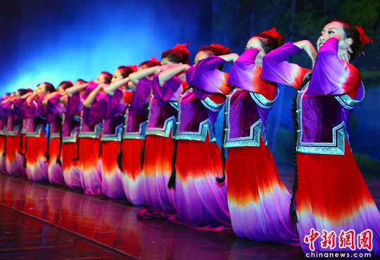 6月17日,内蒙古莫旗乌兰牧骑歌舞团在台北举行《神奇达斡尔》演出记者会,彩排群舞《清水河边的歌声》、鸟春说唱《我的猎鹰》、《达斡尔曲棍球》等节目。中新社发 宋吉河 摄