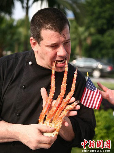 图为美国名厨“大土豆”展示阿拉斯加蟹腿海鲜烧烤。中新社发 张浪 摄