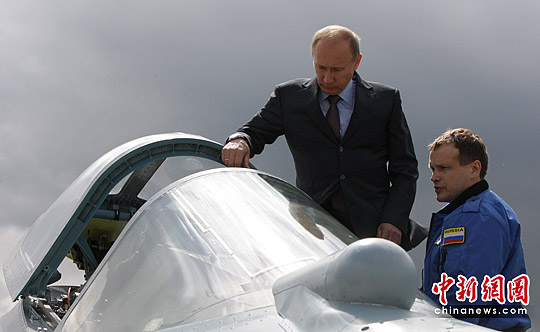 当地时间6月17日,在俄罗斯首都莫斯科市郊外的茹科夫城,俄罗斯总理普京由试飞员陪同登上由俄罗斯苏霍伊公司研制的第五代隐形战斗机T-50参观。