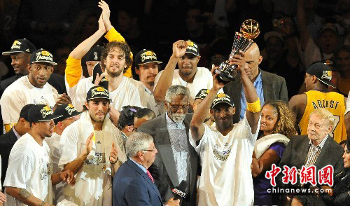 当地时间6月17日晚,洛杉矶湖人以83比79战胜凯尔特人,蝉联NBA总冠军。湖人队员高举总冠军奖杯,科比如愿荣获总决赛“最有价值球员”(MVP)称号。中新社发 张炜 摄