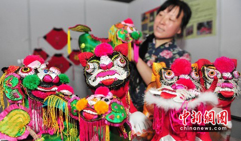 图为山西民间艺术家杨雅琴展示她手工制作的传统工艺品“瑞虎”。中新社发 李学仕 摄