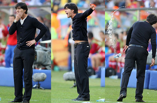 当地时间2010年6月18日,伊丽莎白港,德国队主教练勒夫因不满裁判的判罚愤怒地扔出矿泉水瓶。