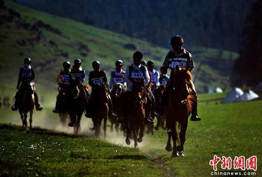 经过两天的集结赛之后,新疆喀纳斯首届国际马术拉力赛进入紧张的一星级耐力赛阶段,33支参赛队伍近百名骑手策马驰骋于被誉为“人间仙境”山花烂漫的喀纳斯景区的草场之中,紧追不舍相互角逐。