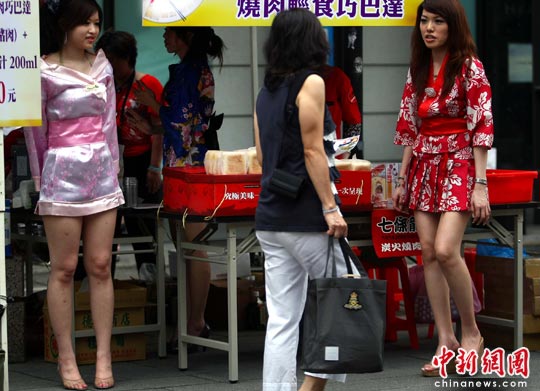 6月19日周末,台北一处商业繁华地带两位少女身着艳丽服饰帮一家食品商店营销。中新社记者 宋吉河 摄