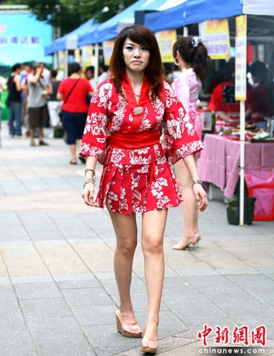 6月19日周末,台北一处商业繁华地带两位少女身着艳丽服饰帮一家食品商店营销。中新社记者 宋吉河 摄