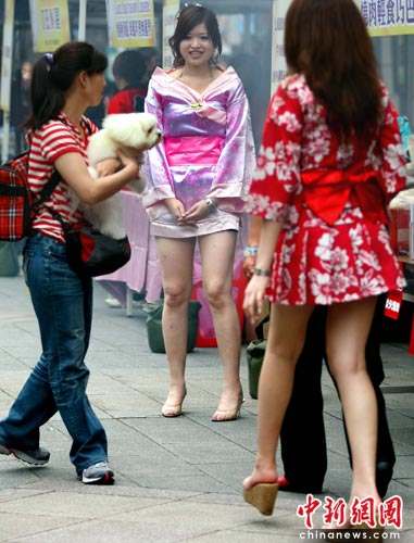 6月19日周末,台北一处商业繁华地带两位少女身着艳丽服饰帮一家食品商店营销。中新社记者 宋吉河 摄