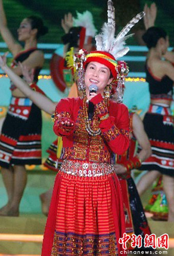 6月19日晚,《中华情·海峡缘》晚会上,台湾高金素梅文化团队为现场观众带来原始原音的享受,现场6000多台胞不禁动容。中新社发 张丽君 摄
