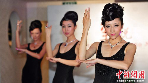 图为模特展示碧玺首饰精品。中新社发 李学仕 摄