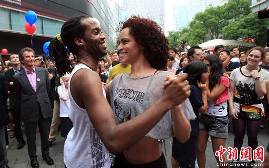 两位法国人在上海新天地翩翩起舞。中新社发 潘索菲 摄