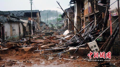 6月21日,福建南平地区持续暴雨,暴雨长时间袭击后致南平建阳将口镇芹口村民房墙倒梁断,狼籍不堪。自13日以来,南平下辖各地持续发生暴雨到特大暴雨,引发了严重的滑坡、泥石流等地质灾害,造成铁路塌方、交通受阻,电力、通信、供水中断,带来人员伤亡和经济损失。中新社发 张贵兴 摄