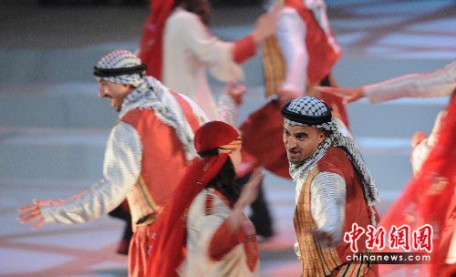 6月21日晚间,第二届阿拉伯艺术节联合演出在北京21世纪剧院上演,来自巴勒斯坦的舞蹈家们表演了精彩的民族舞节目。中新社发 侯宇 摄