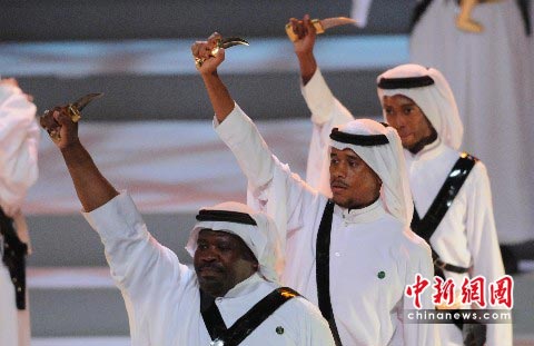 6月21日晚间,第二届阿拉伯艺术节联合演出在北京21世纪剧院上演,来自沙特阿拉伯的民间艺术家们为中国观众表演了传统的《剑舞》。中新社发 侯宇 摄