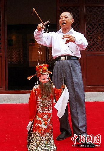 一位民间木偶表演艺术家在福建上杭族谱馆提着一个近1米高的木偶出场,边唱边表演,引得来此参观的台胞纷纷叫好。中新社发 张丽君 摄