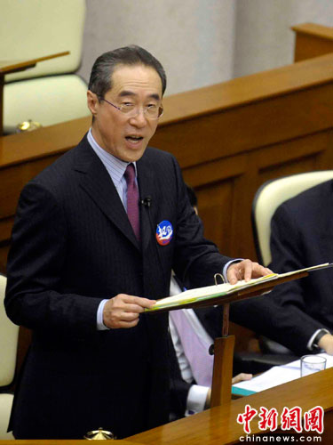 政务司司长唐英年在发言时呼吁议员支持政改方案。中新社发 谭达明 摄