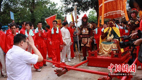 6月23日,在广西恭城县城,一名男子在祭拜关羽。当日,广西恭城瑶族自治县2010年关帝庙会举行关公大型巡游活动。50多只来自中国内地的高跷、芦笙、舞狮舞龙、扮台阁、旱船、腰鼓、钱鞭等文艺队伍参加巡游,吸引了20多万人如潮涌般赶来一睹为快。巡游所到之处,街道两旁均被游客挤得满满当当。中新社发 郑智敏 摄