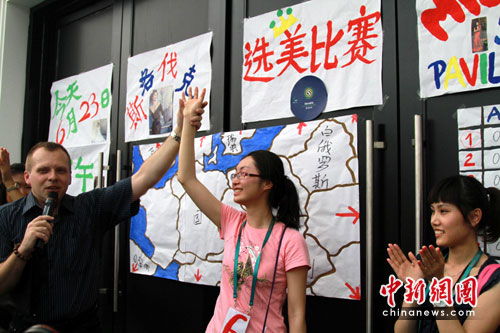 6月23日,上海世博会斯洛伐克馆举行“选美比赛”,馆方设置了世博会和斯洛伐克相关的知识考题,选出最具有吸引力、最迷人、最具才智的“斯洛伐克馆美女”。经过几番激烈而轻松的竞争,来自上海的沈瑾(中)获得第一名。 中新社发 殷春永 摄