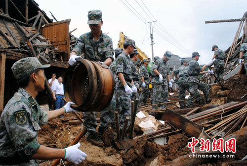 6月23日,南京军区海防某部官兵在福建建阳市将口镇芹口村抢救被倒塌民房掩埋的财产。自13日以来,福建遭受特大暴雨袭击,造成了历史罕见的自然灾害,其中截至21日,南平全市受灾人口1282442人,倒塌房屋21123间,直接经济损失43.5元亿人民币。中新社发 王柳珍 摄