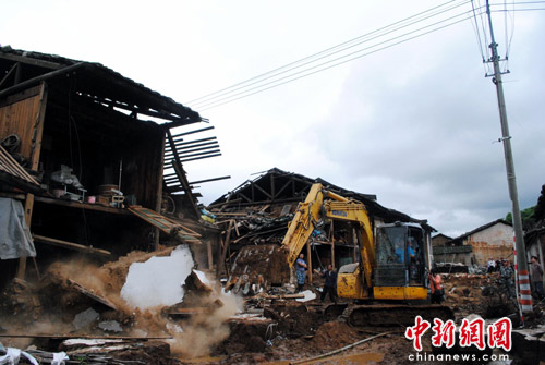 6月23日,福建建阳排险抢救工程队深入偏远农村,推倒危房,排除险情,开展排险抢救。自13日以来,福建轮番遭受特大暴雨袭击,造成了历史罕见的自然灾害。中新社发 王柳珍 摄