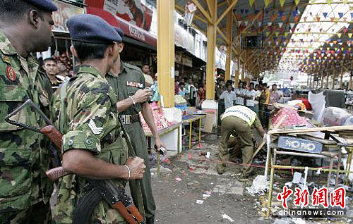 斯里兰卡安全人员在首都科伦坡的一起爆炸事件现场检查。