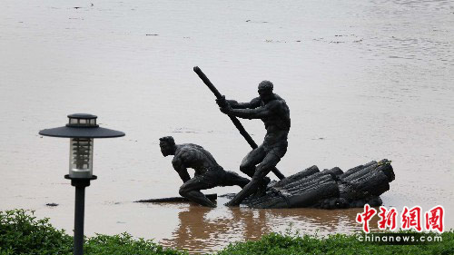 6月24日,福州市闽江公园北园《闽江放排》雕塑的两位 “排工”正在滔滔洪水中吃力地“撑排”。中新社发 杨婀娜 摄