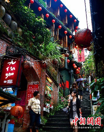 台湾九份老街雨天人更多。中新社发 宋吉河 摄