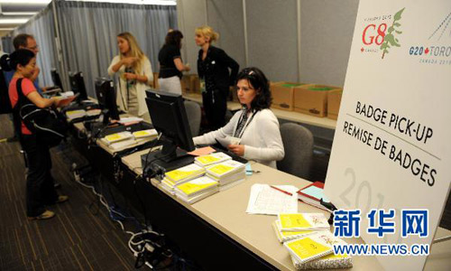 6月23日,在位于加拿大多伦多的和八国集团(G8)峰会和二十国集团(G20)峰会新闻中心,记者领取采访证件。申宏 摄