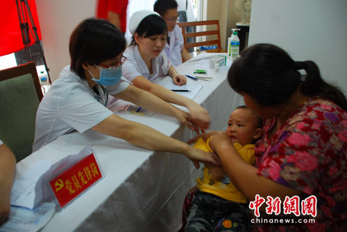 南昌大学第一附属医院抗洪救灾医疗点的医生正在为一名小孩看病。作 者:刘占昆