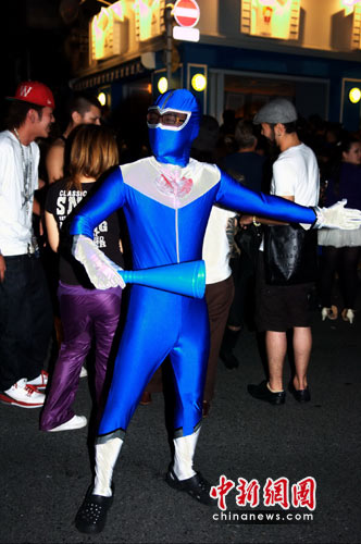 位于日本东京涩谷的球迷酒吧挤满了前来看球的球迷。图为一个打扮奇特的球迷扮成“交通管理员”为其他球迷维持秩序。作 者:孙冉