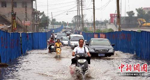 图为上班族涉水经过长沙南湖路。中新社发 白祖偕 摄