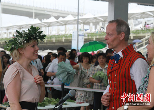 6月25日,在瑞典传统歌曲和手风琴表演的伴奏下,花艺师在上海世博会瑞典馆忙碌着,他们用各种鲜花、树叶和花环装饰完成十字形“五月柱”,还编织出各种颜色的鲜花花环和装饰物,将瑞典馆装饰起来,营造出了一片鲜花盛开的仲夏节快乐气氛。当天,瑞典馆与来访的世博参观者共同欢庆北欧的重要节日--仲夏节。