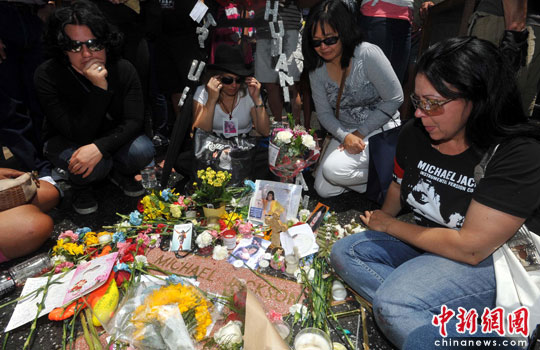 来自全球各地的歌迷自发来到位于好莱坞星光大道的“迈克尔·杰克逊星”旁,纪念这位“流行天王”,一些歌迷在现场不仅潸然泪下。中新社发 张炜 摄