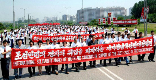 正在朝鲜参加国际青年大会的外国青年学生25日在平壤举行声援朝鲜人民正义斗争的游行。