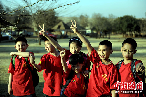 6月26日,南非豪登省犀牛与狮子保护区,来自中国的六名世界杯球童表示祝愿阿根廷在27日举行世界杯阿根廷墨西哥之战中取胜。27日,这六名中国儿童将在南非世界杯赛场上担任小球童。中新社发 廖攀 摄