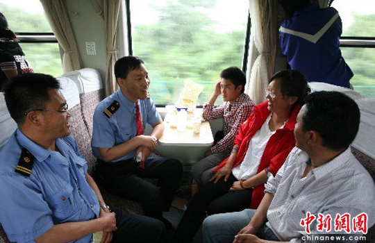 图为带队老师与值乘列车长等交流。中新社发 刘忠俊 摄