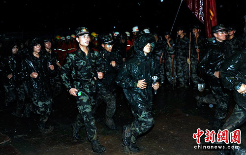 在雨中急行军的武警官兵奔赴事故现场。彭年/CFP