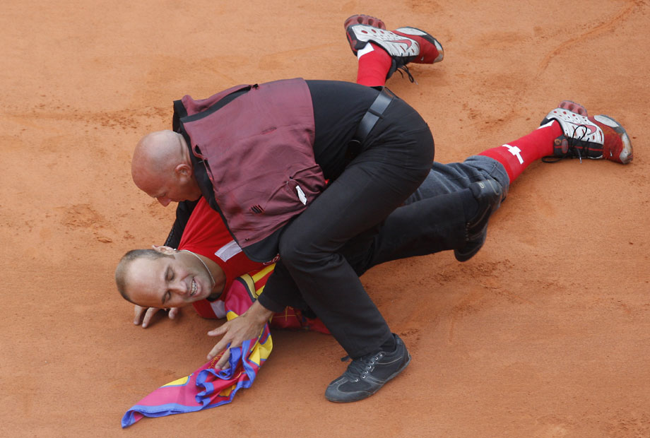 法网男单决赛场上,一位费天王的痴心球迷冲入球场,强行将自制的一顶帽子戴到费德勒的头上。安保人员及时出现,将狂热粉丝架出场外。