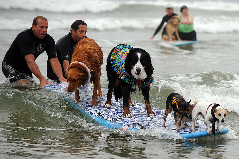 6月20日,在美国加利福尼亚州帝国沙滩举行了一场小狗冲浪比赛,小狗们表现得十分认真。