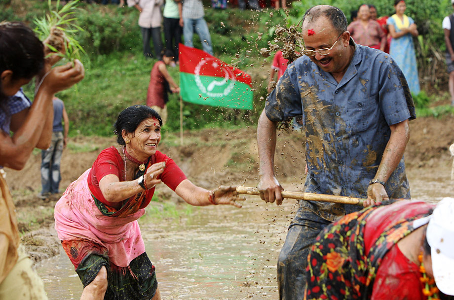 6月29日,尼泊尔首都加德满都郊区的农民在田里泼泥浆庆祝“水稻日”。每年水稻种植季的开始时,尼泊尔当地农民都会用这种传统方式庆祝开耕,祈盼好的收成。