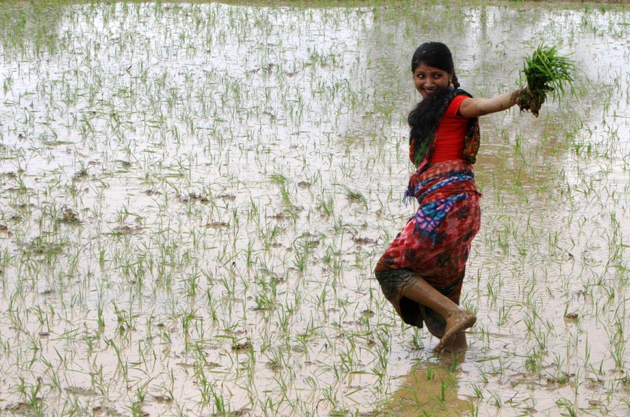 6月29日,尼泊尔首都加德满都郊区的农民在田里泼泥浆庆祝“水稻日”。每年水稻种植季的开始时,尼泊尔当地农民都会用这种传统方式庆祝开耕,祈盼好的收成。