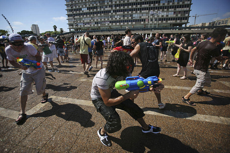7月1日,以色列特拉维夫人们在拉宾广场参加一年一度的打水仗活动。
