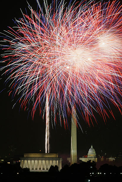 7月4日,为庆祝美国独立日,美国首都华盛顿举行烟火燃放表演。色彩斑斓的烟火在夜空中更加美丽。
