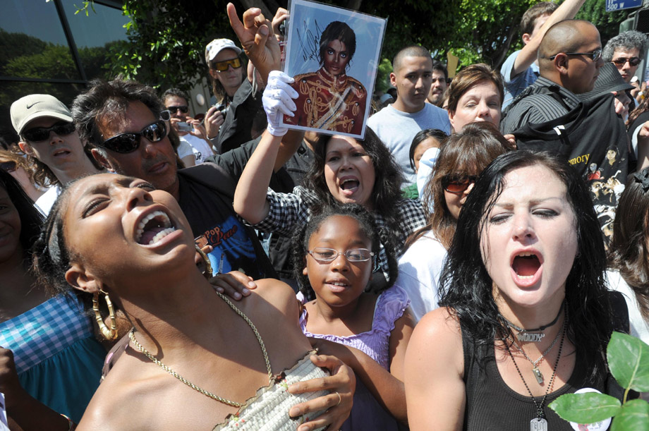数百名没有入场券的歌迷聚集在附近的警戒线外高呼迈克尔的名字,共同悼念一代“流行天王”。 中新社发 张炜 摄