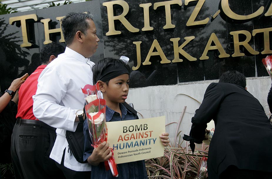7月18日,印度尼西亚首都雅加达的民众纷纷来到发生爆炸的万豪酒店和丽嘉酒店,向死难者献花表示哀悼。