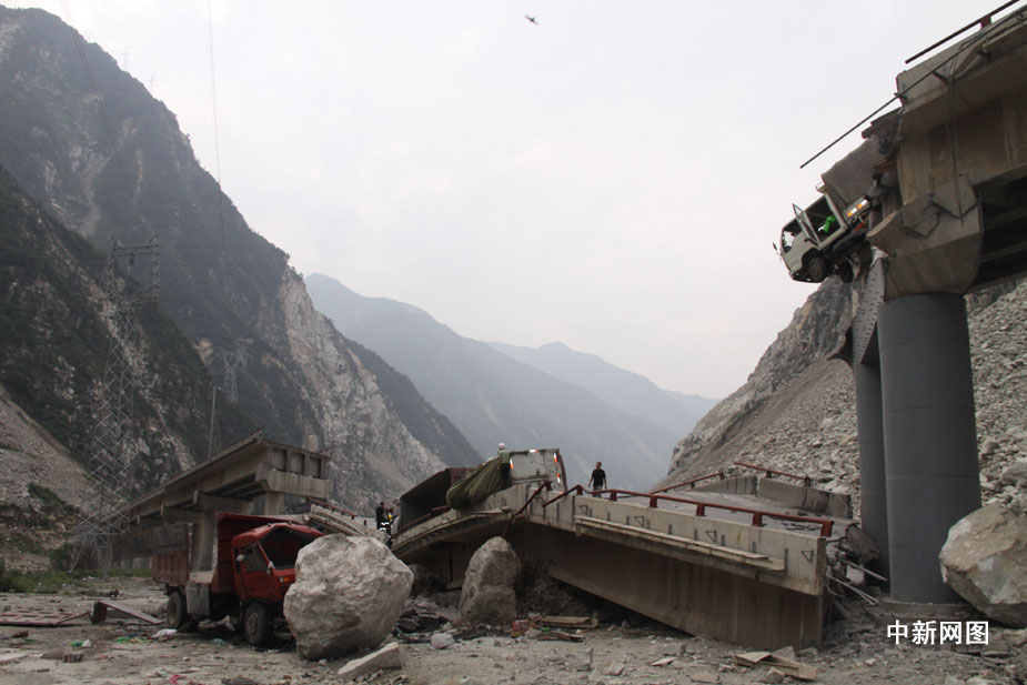 25日凌晨四点钟左右,汶川县境内国道二一三线彻底关大桥被山上飞下来的巨石砸断,已造成100米的桥面坍塌,7辆汽车受损,12人不同程度受伤,3人死亡,都汶路通行中断。汶新 摄