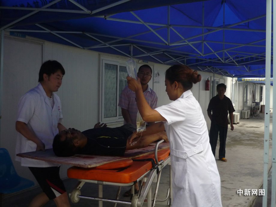 25日凌晨四点钟左右,汶川县境内国道二一三线彻底关大桥被山上飞下来的巨石砸断,已造成100米的桥面坍塌,7辆汽车受损,12人不同程度受伤,3人死亡,都汶路通行中断。图为汶川县人民医院正在积极抢救伤员。 汶新 摄